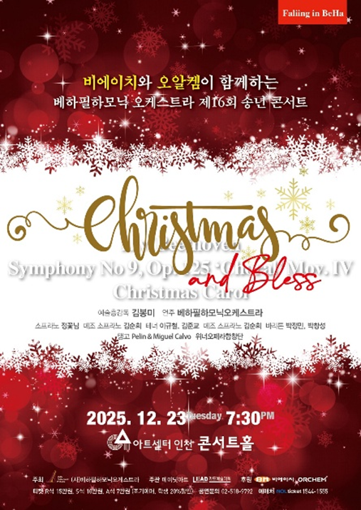 제16회 베하필하모닉 송년 콘서트 포스터 송년 콘서트는 ‘Christmas and Bless’를 주제로 예술총감독 겸 지휘자 김봉미의 지휘 아래 진행됐으며, 소프라노 정꽃님과 제7회 아슬리코 콩쿠르 수상자 바리톤 박창성이 협연으로 참여해 공연의 완성도를 높였다. 성탄의 분위기를 담은 곡들부터 깊은 서사를 품은 작품까지 다양한 레퍼토리가 오케스트라의 섬세하고 밀도 높은 연주로 펼쳐졌다.